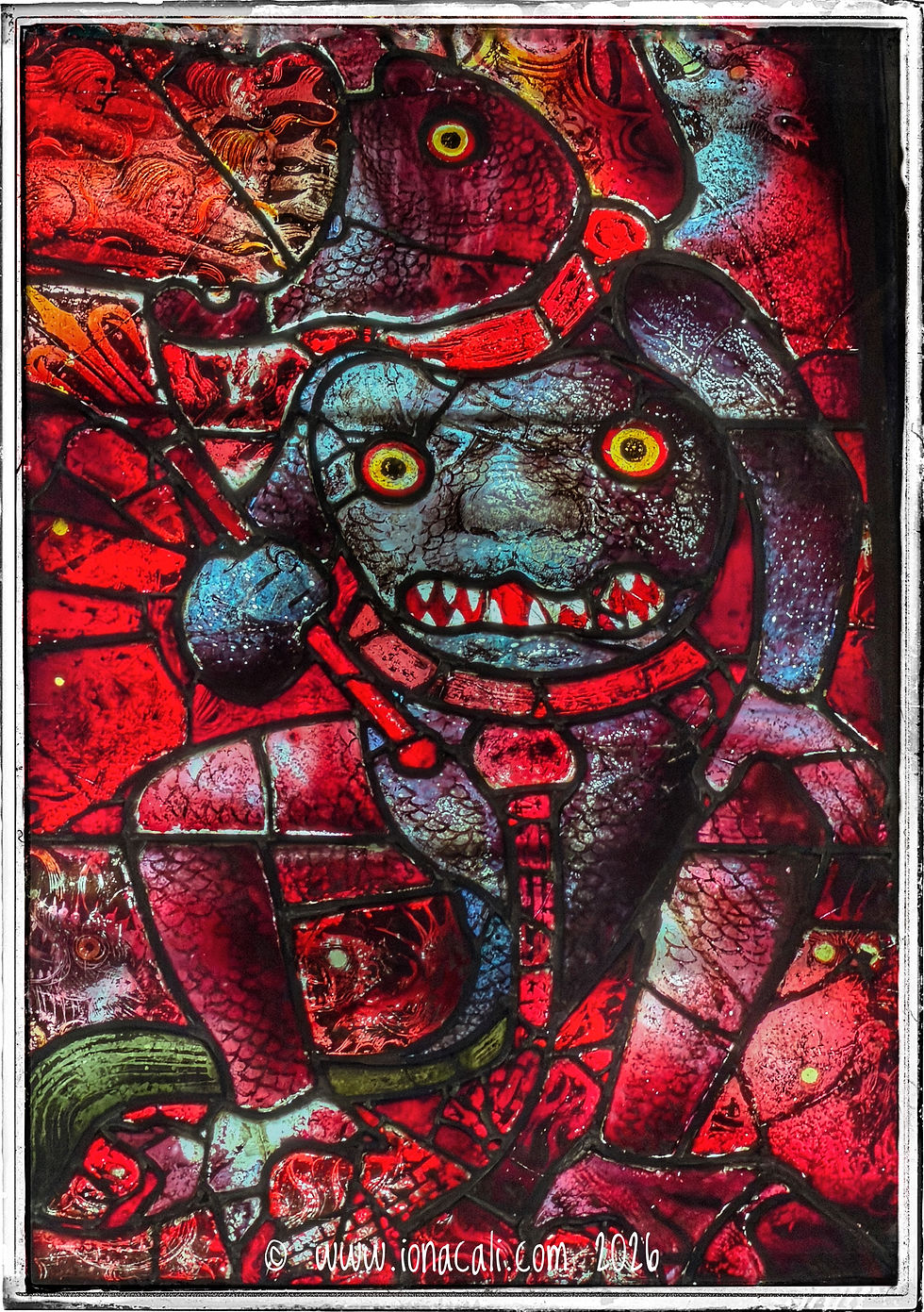 This is a close-up of the lower right-hand of the gable window in St Mary’s, Fairford. This church has the only remaining, intact, collection of late Medieval Stained Glass windows and they are stunning, but we were not expecting to see this!